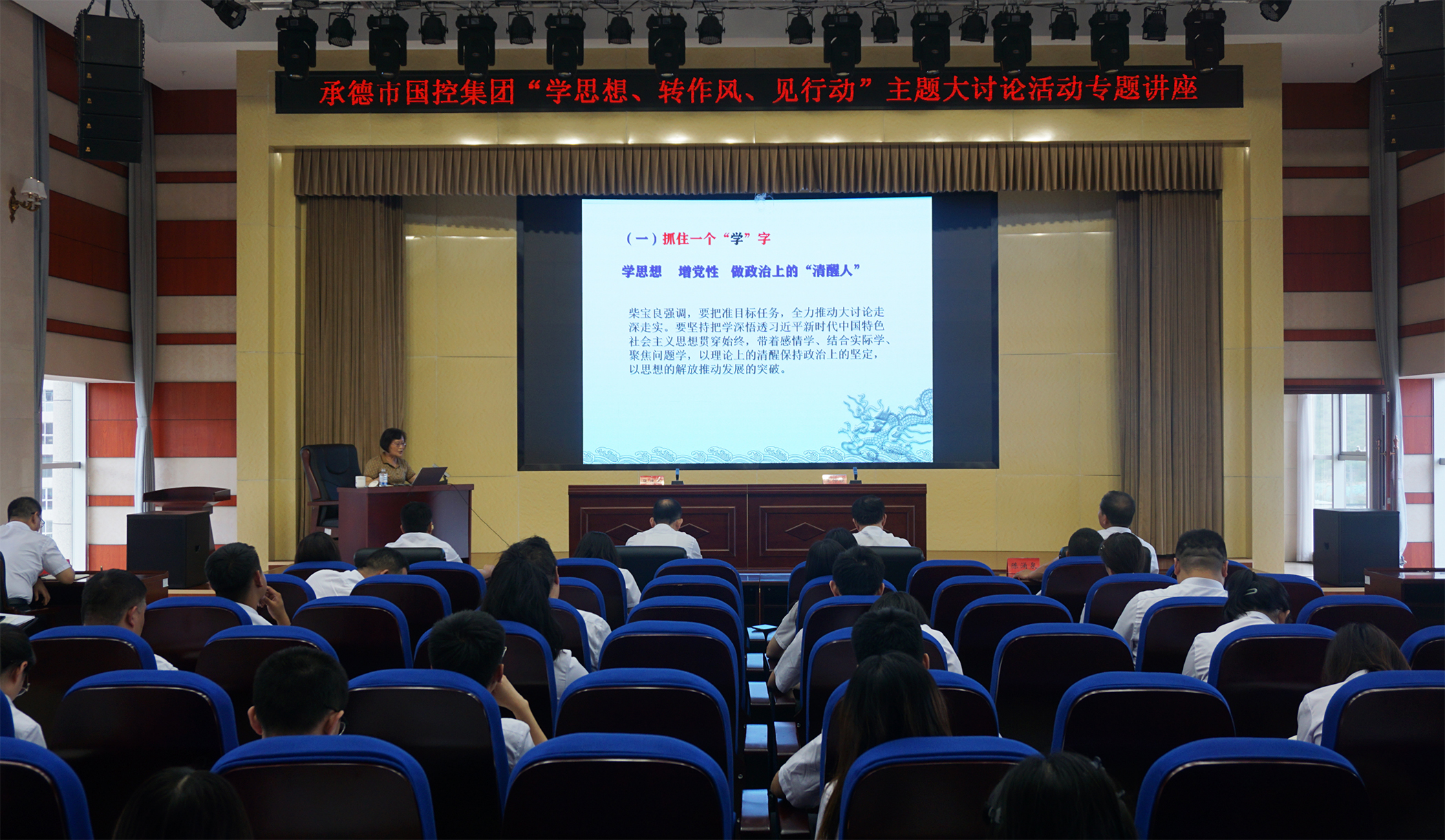 2023年7月6日,为深入学习贯彻习近平总书记关于坚持不懈抓好作风建设的重要论述,落实市委市政府关于在全市开展“学思想、转作风、见行动”主题大讨论活动精神,市精品偷拍一区二区三区在线看邀请承德市委党校党史党建教研室主任王仲娟教授,开展了“学思想、转作风、见行动”主题大讨论活动专题讲座,市精品偷拍一区二区三区在线看领导班子、集团本部全体员工、实际控制子公司中层以上负责同志及党员员工参加讲座。
